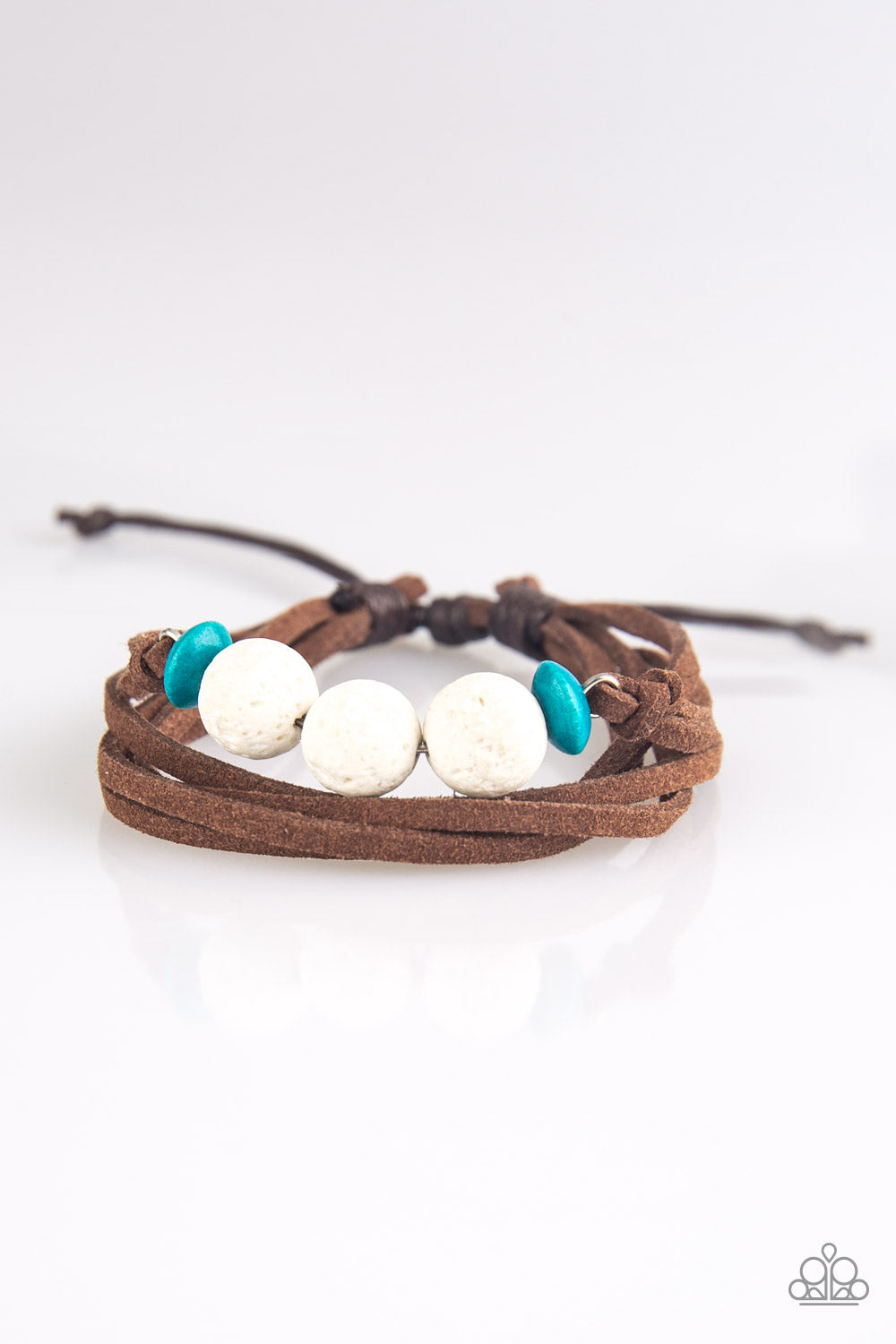 Infused with layers of brown suede, white lava rocks and blue wooden beads are secured in place across the wrist for an adventurous look. Features an adjustable sliding knot closure.