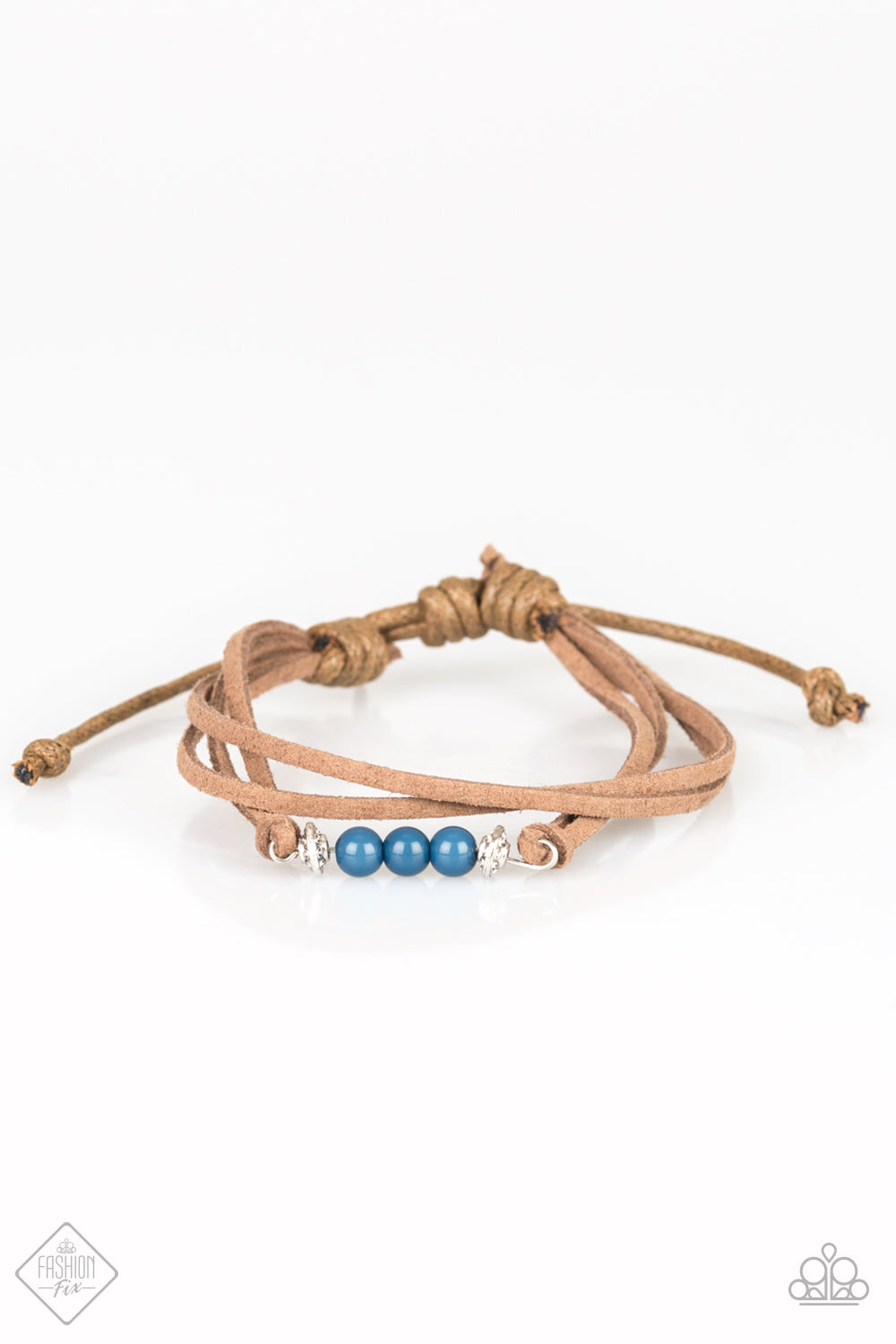 Strands of earthy brown suede layer around the wrist, creating a beautiful neutral backdrop for a row of vibrant blue beads to take center stage. Features an adjustable sliding knot closure.