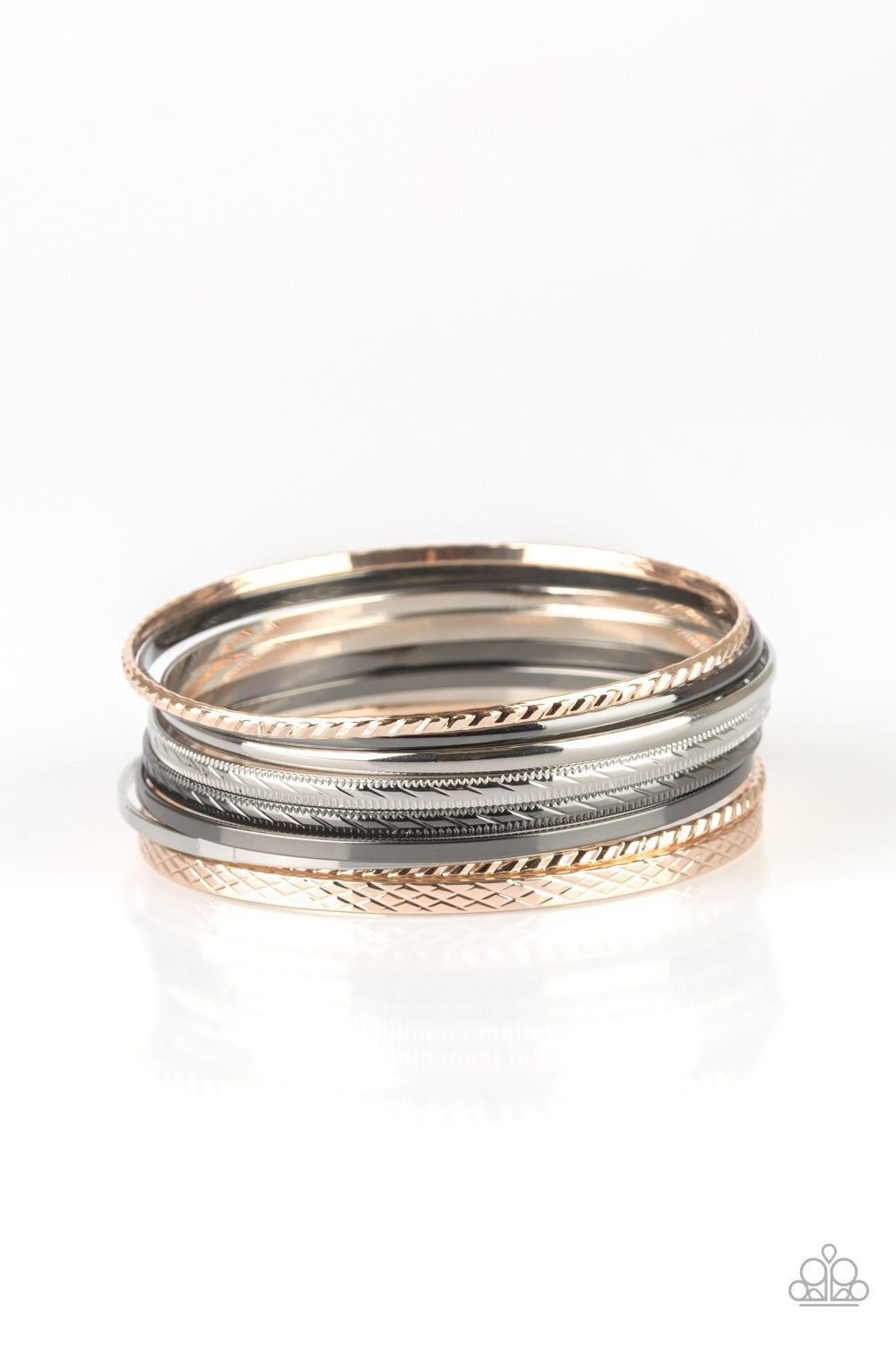 Featuring smooth and textured finishes, a collection of mismatched silver, rose gold, and gunmetal bangles stack across the wrist for a classic look.