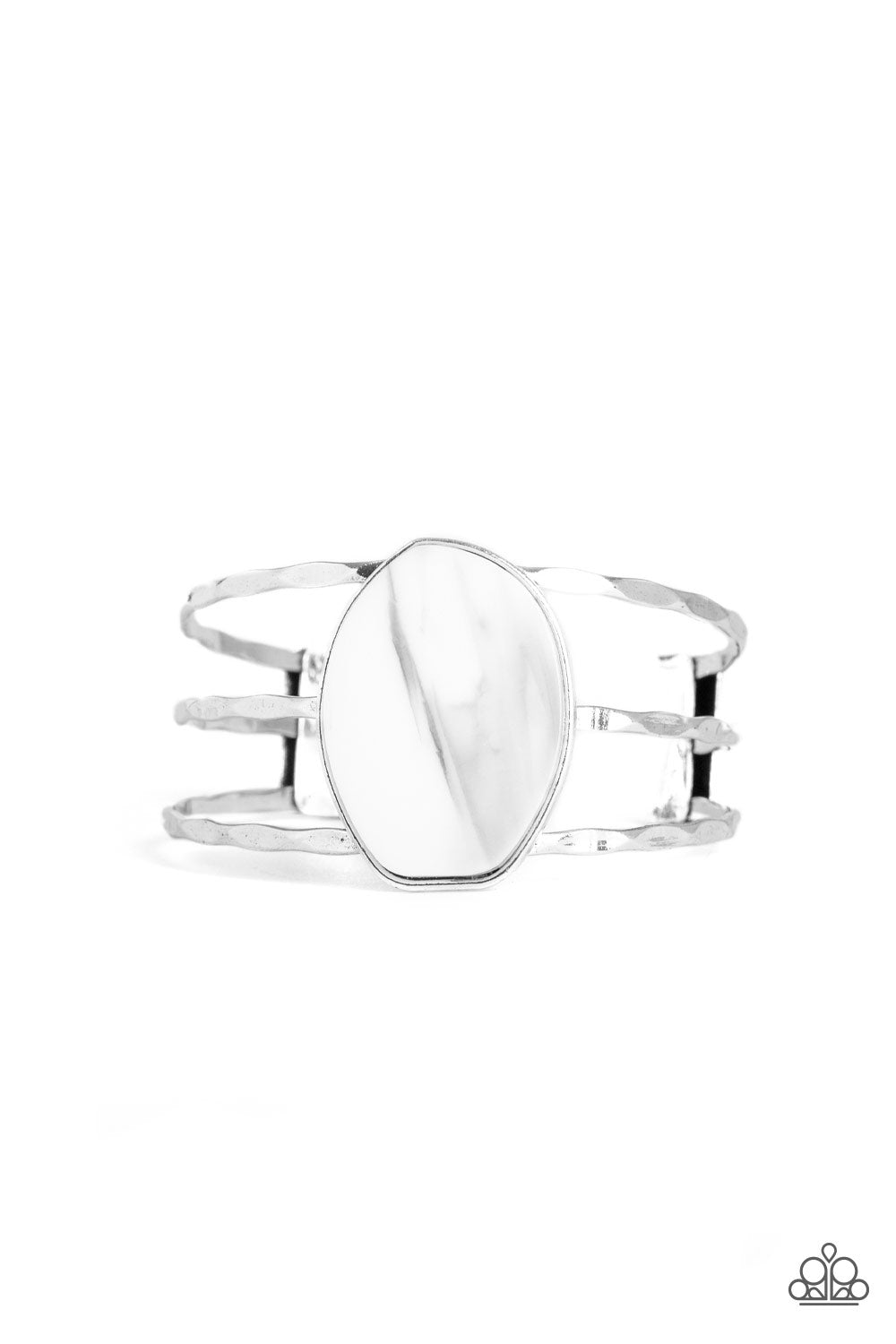 Featuring a faux rock finish, a refreshing white acrylic piece sits atop a trio of hammered silver bars that coalesce into an airy cuff for an artisan inspired look.