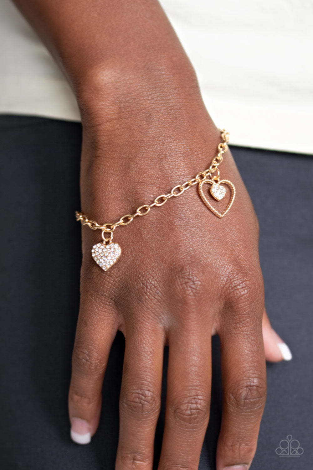 A charming collection of gold hearts and white rhinestone encrusted heart frames dangle from a glistening gold chain, creating a flirtatious fringe around the wrist. Features an adjustable clasp closure.