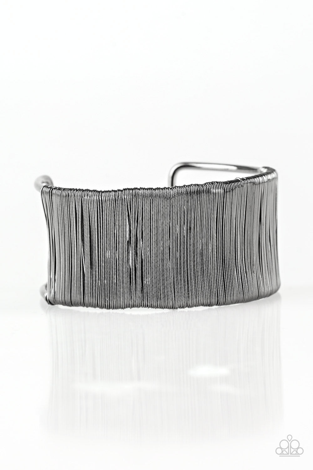Shiny gunmetal wire wraps around the center of an airy gunmetal frame, creating a bold industrial cuff.