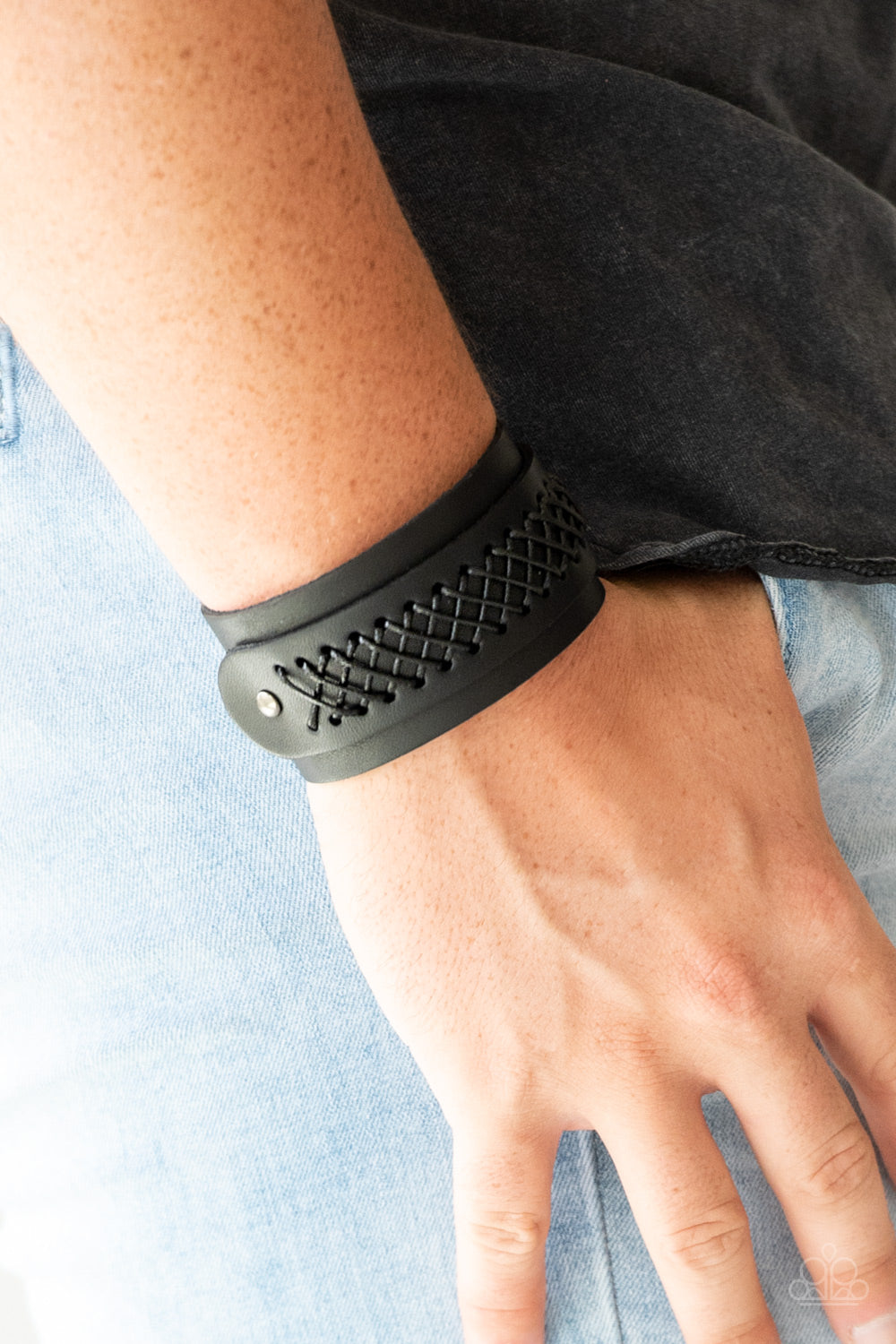 Stitched in crisscrossing black thread, a black leather band is studded in place along a thicker black leather band for a rugged look. Features an adjustable snap closure.