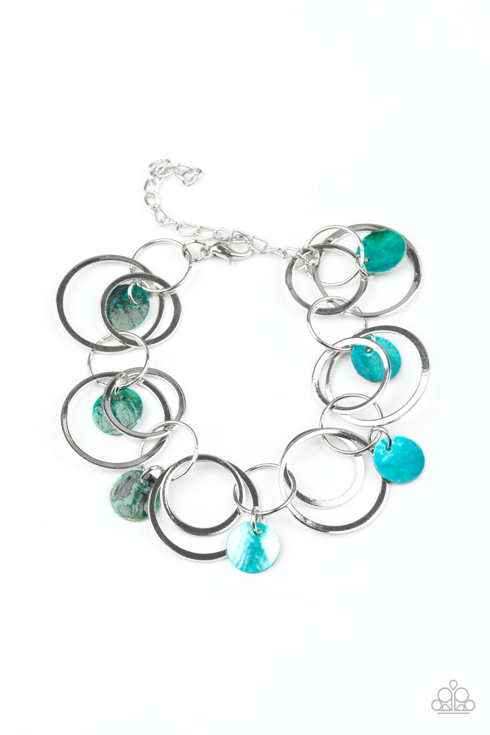 Bits of iridescent blue shell swing from the bottoms of mismatched silver hoops around the wrist for a summery look. Features an adjustable clasp closure.