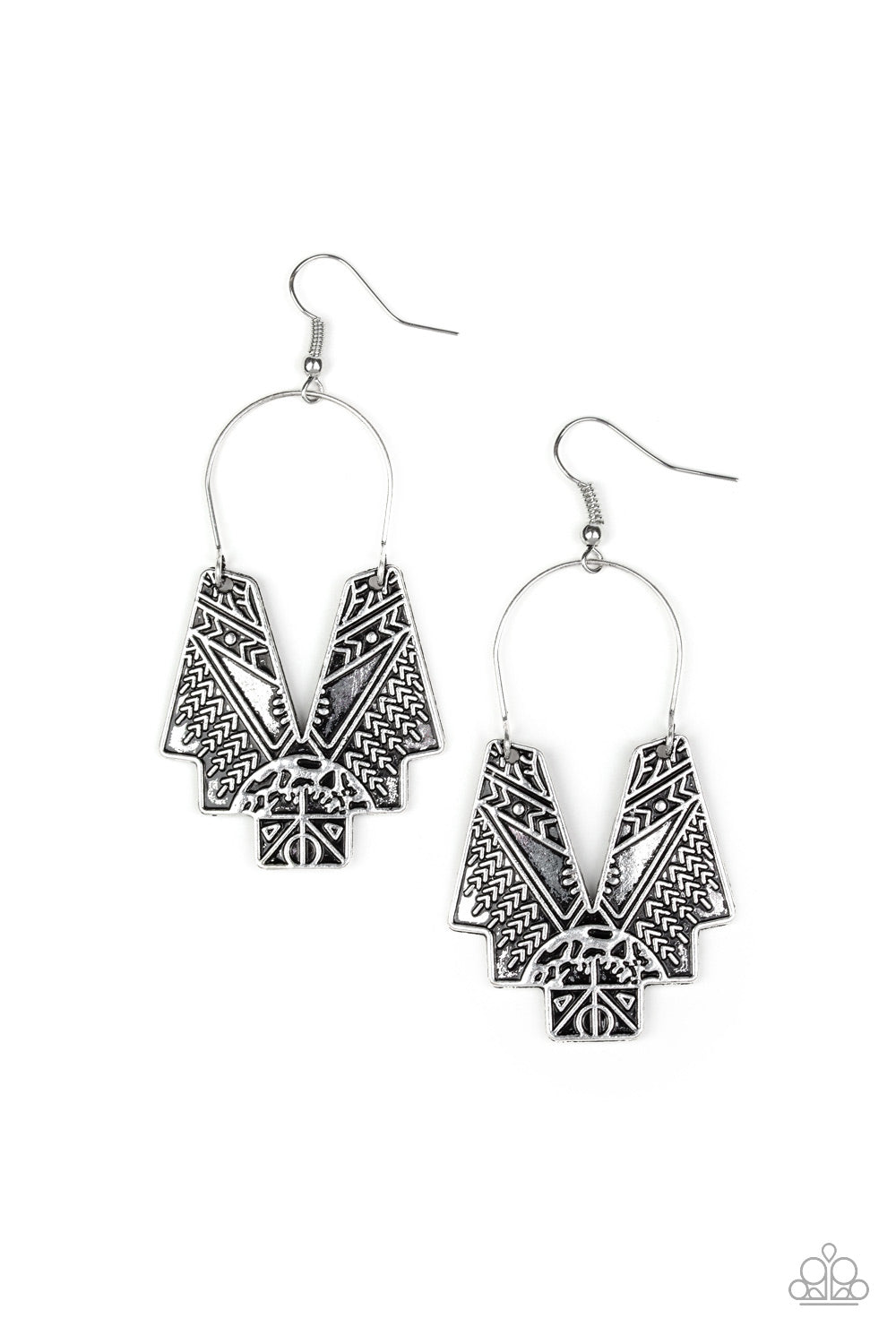 Embossed in tactile tribal inspired patterns, an abstract geometric frame swings from a silver wire fitting for a tribal inspired look. Earring attaches to a standard fishhook fitting.