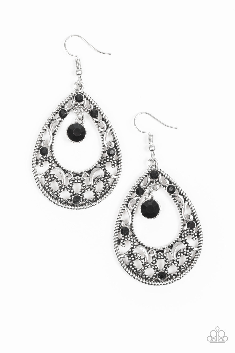 Glistening and studded silver filigree swirls along a shimmery silver frame radiating with glittery black rhinestones. A sparkling black rhinestone swings from the top of the frame for a refined finish. Earring attaches to a standard fishhook fitting.