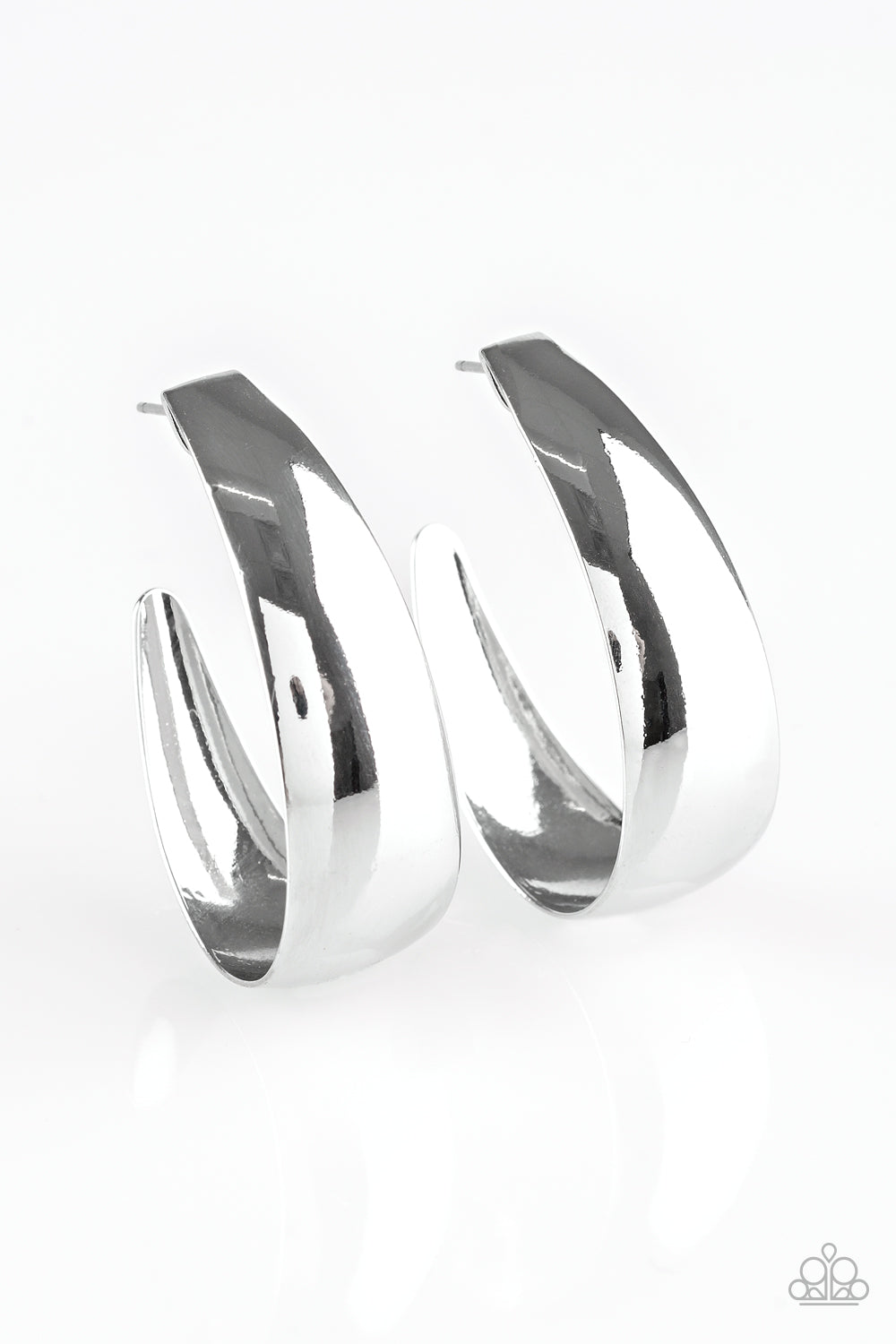 Brushed in a high-sheen finish, a glistening silver frame sharply curls beneath the ear for a casual look. Earring attaches to a standard post fitting. Hoop measure 1" in diameter.