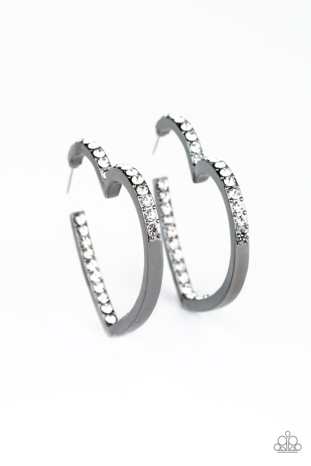 Encrusted in sections of glittery white rhinestones, a glistening gunmetal hoop curls into a charming heart shape for a heart-stopping look. Earring attaches to a standard post fitting. Hoop measures approximately 2" in diameter.