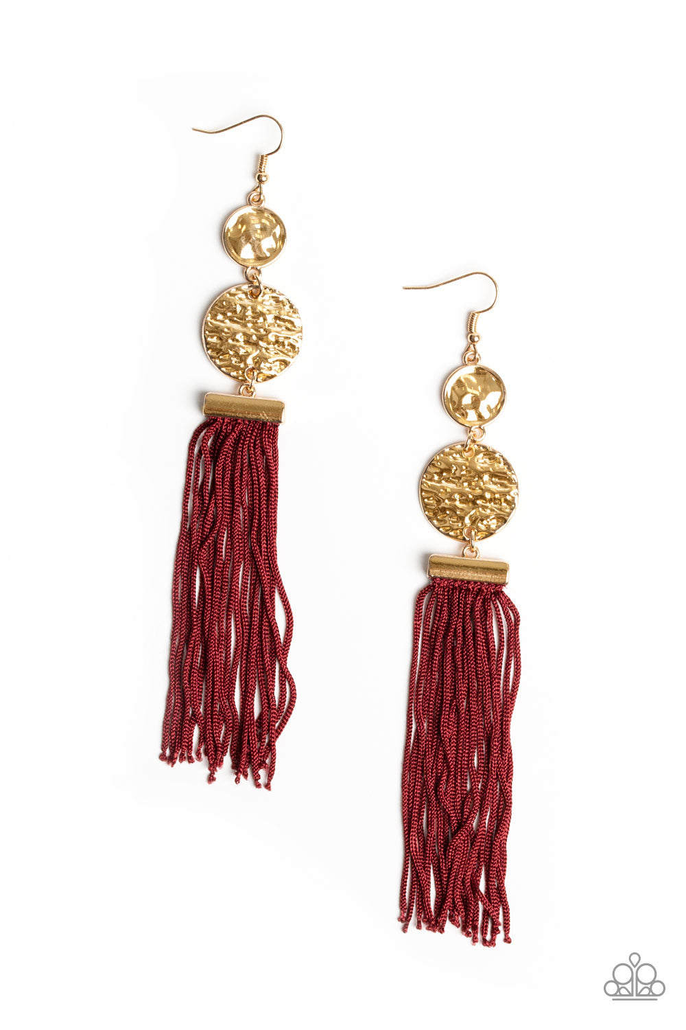 A collection of Biking Red cording streams from the bottom of stacked hammered gold discs, creating a whimsical tassel. Earring attaches to a standard fishhook fitting.