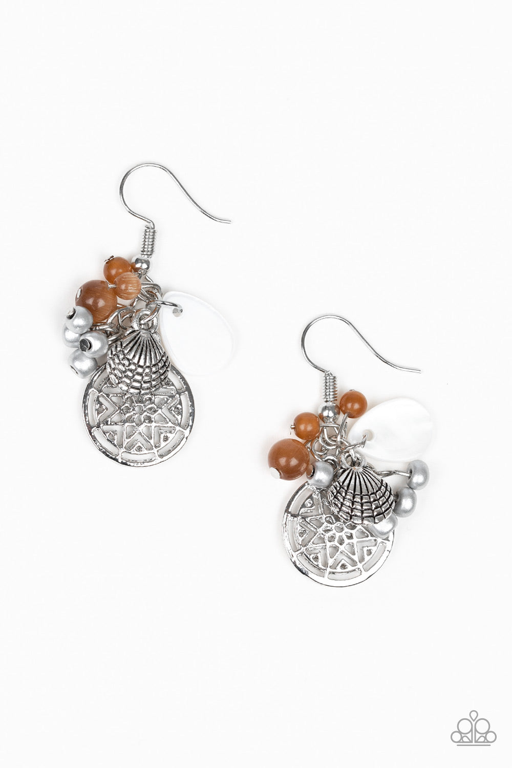 A collection of pearly silver seed beads, a shell-like teardrop, and brown cat's eye beads trickle from the ear. Brushed in a shimmery finish, a silver seashell and nautical inspired frame are added to the clustered fringe for a whimsical finish. Earring attaches to a standard fishhook fitting.