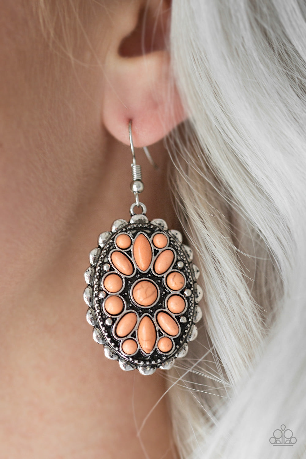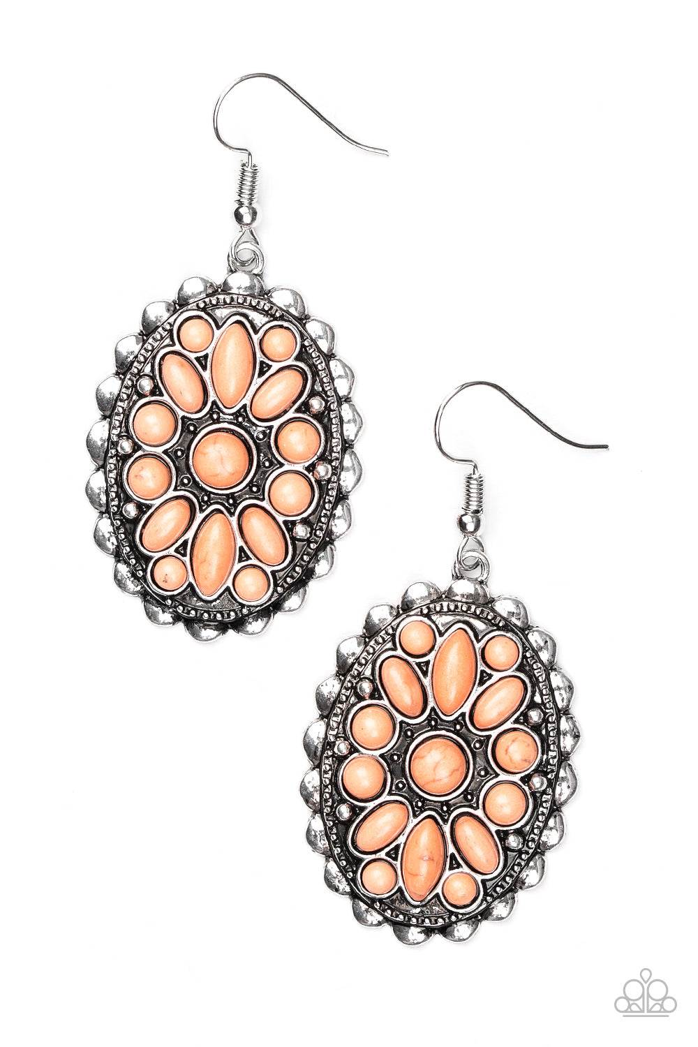 Varying in shape, orange stones are pressed into a textured silver frame, creating a whimsical floral pattern. Earring attaches to a standard fishhook fitting.