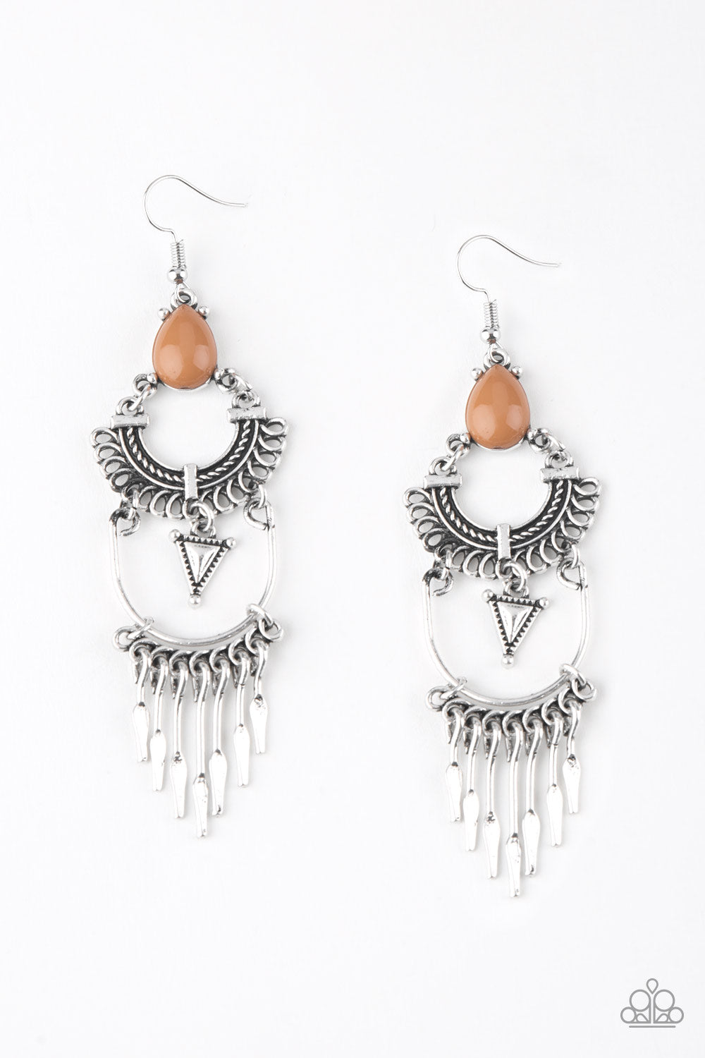 A Meerkat teardrop bead sits atop stacked silver frames that are linked together to allow flowy movement. Featuring tribal inspired patterns, the dramatically stacked frames give way to flared rods for an edgy fringed finish. Earring attaches to a standard fishhook fitting.