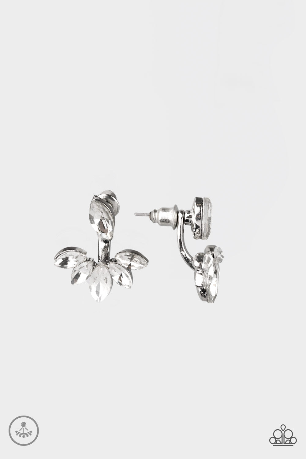 A solitaire white marquise cut rhinestone attaches to a double-sided post, designed to fasten behind the ear. Encrusted in matching white rhinestones, a double-sided post peeks out beneath the ear, creating a glittery fringe. Earring attaches to a standard post fitting.