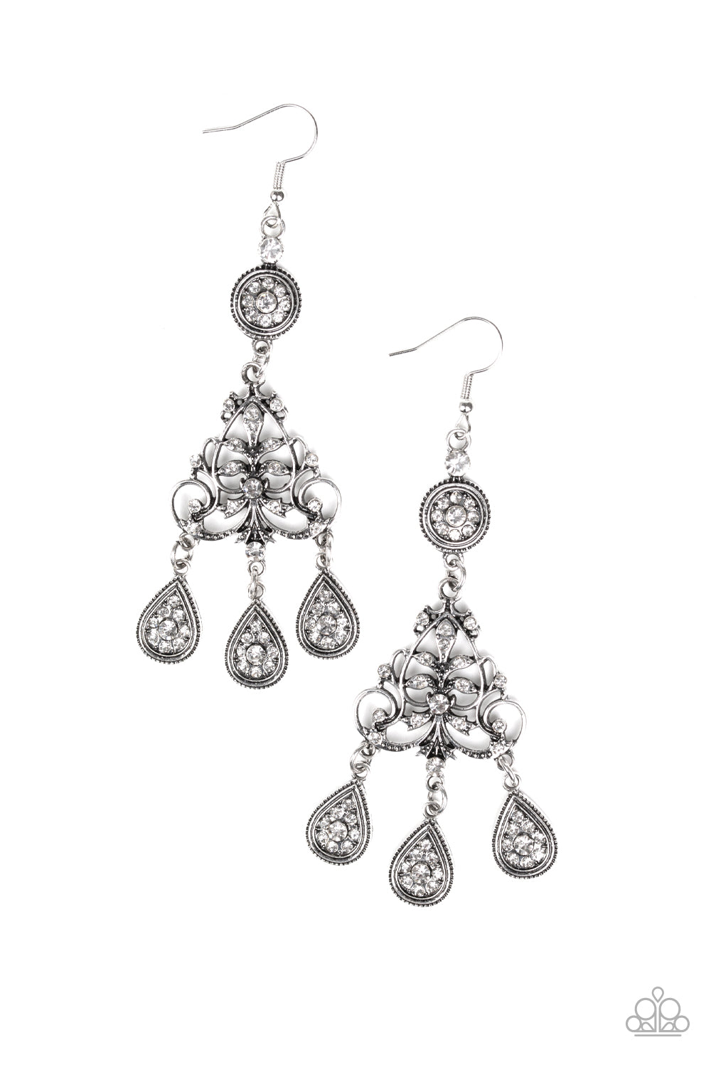White rhinestone encrusted silver teardrops drip from the bottom of an ornate silver frame. Dusted in rhinestones, the frilly frame swings from the bottom of a round white rhinestone fitting, creating an elegant chandelier. Earring attaches to a standard fishhook fitting.