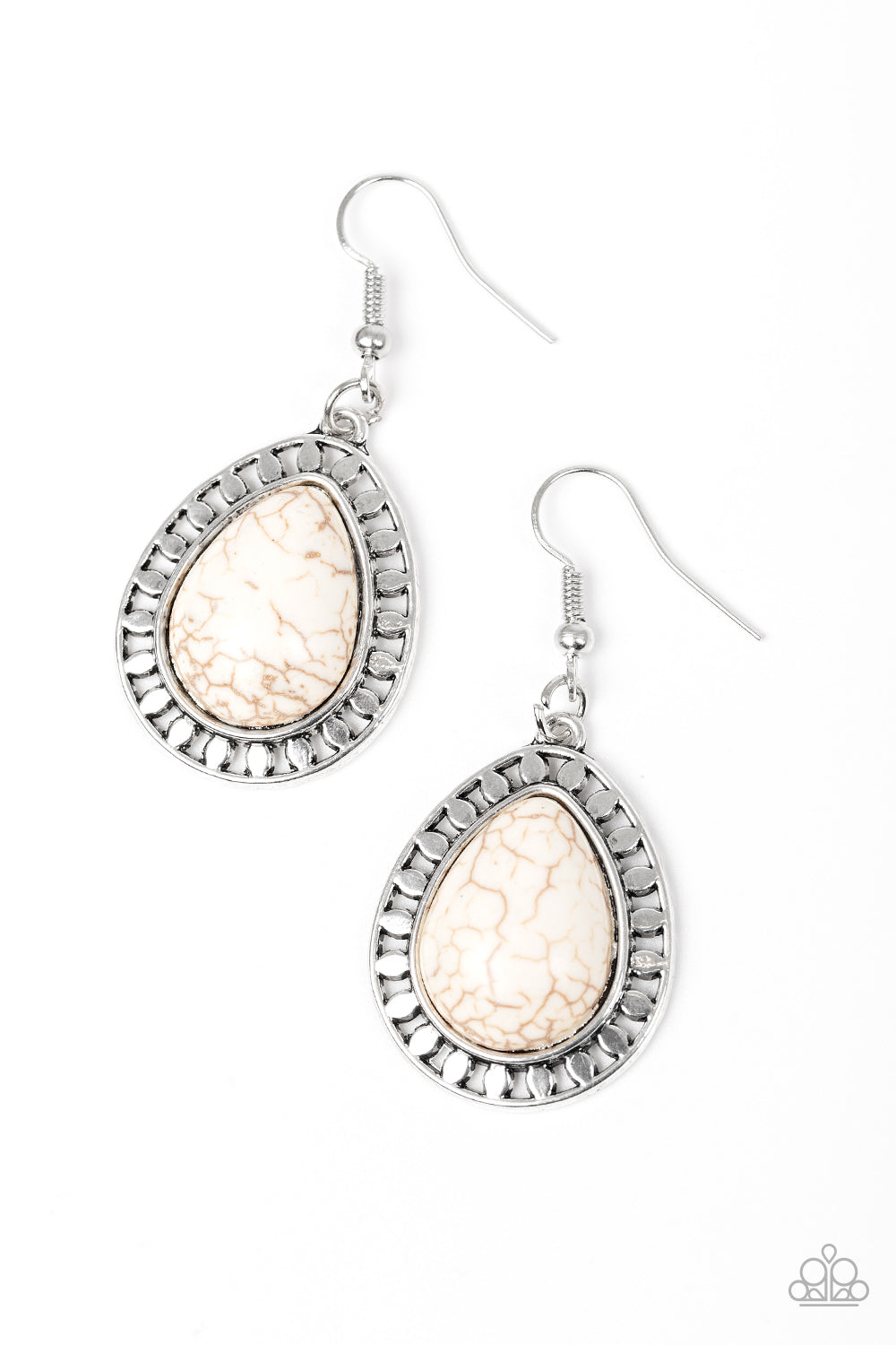 Chiseled into a tranquil teardrop, a refreshing white stone is pressed into a shimmery silver frame radiating with tribal inspired textures for a seasonal look. Earring attaches to a standard fishhook fitting.