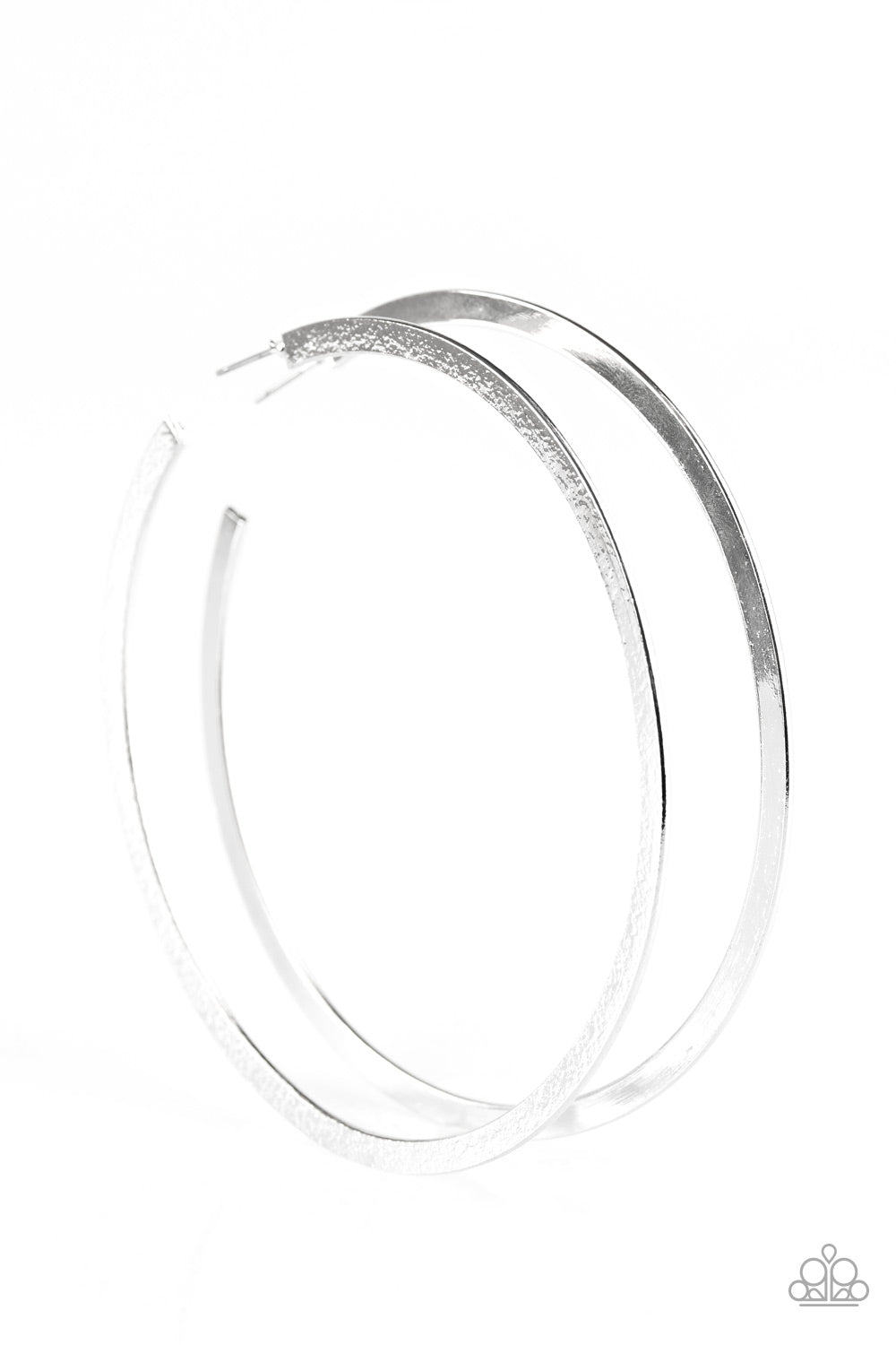 One side of a silver hoop is delicately hammered, adding blinding shimmer to the dramatic palette. Hoop measures 3 1/2” in diameter. Earring attaches to a standard post fitting.