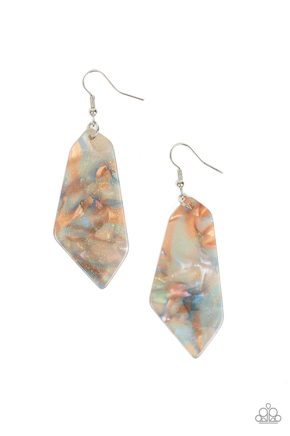 Featuring watercolor-like patterns, an abstract acrylic frame swings from the ear for a retro fashion. Colors may vary. Earring attaches to a standard fishhook fitting.