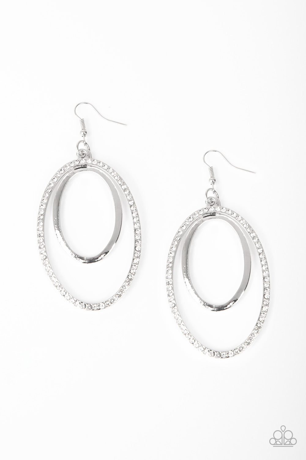 A glistening silver hoop swings from the top of a larger silver hoop radiating with glassy white rhinestones for a refined look. Earring attaches to a standard fishhook fitting.