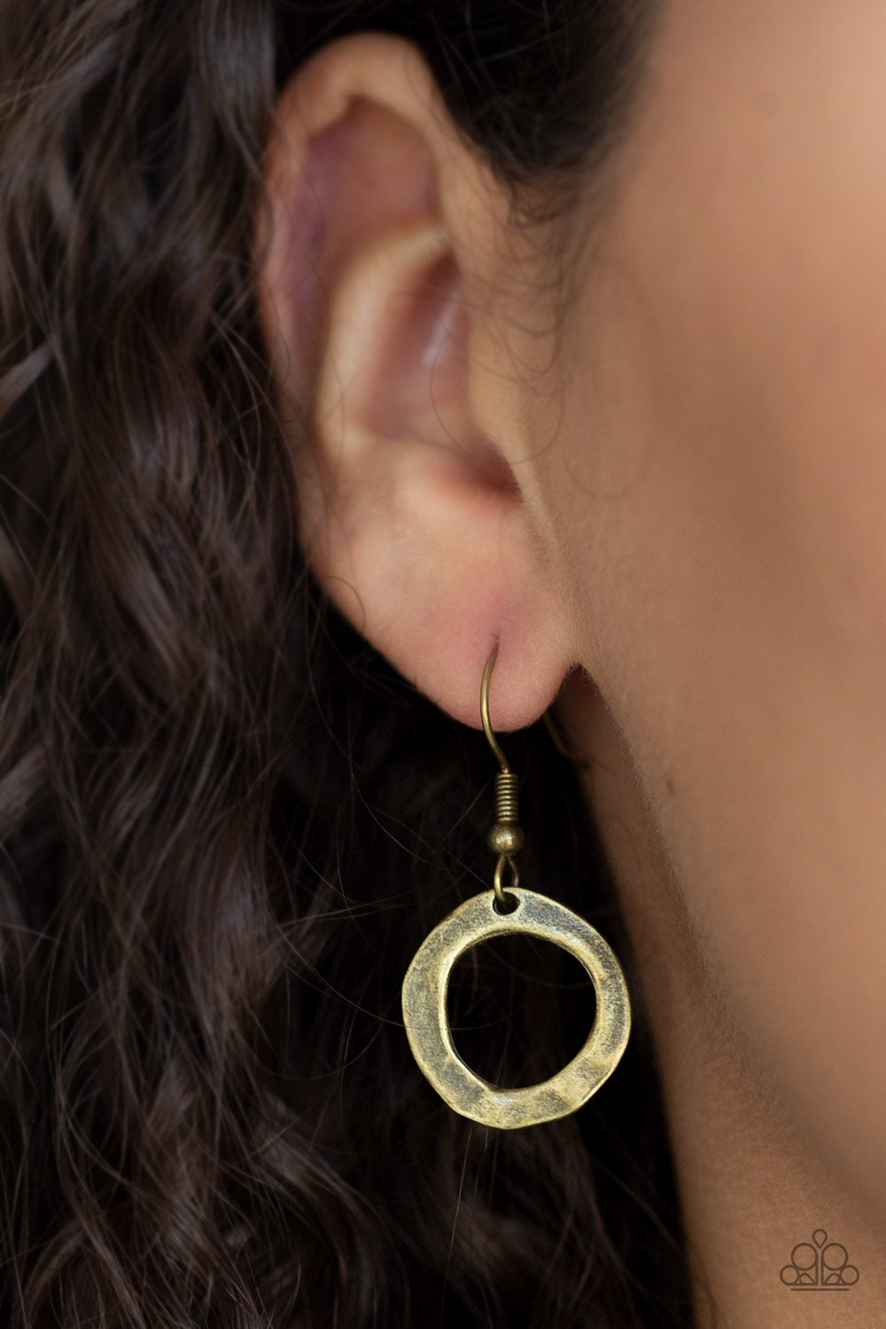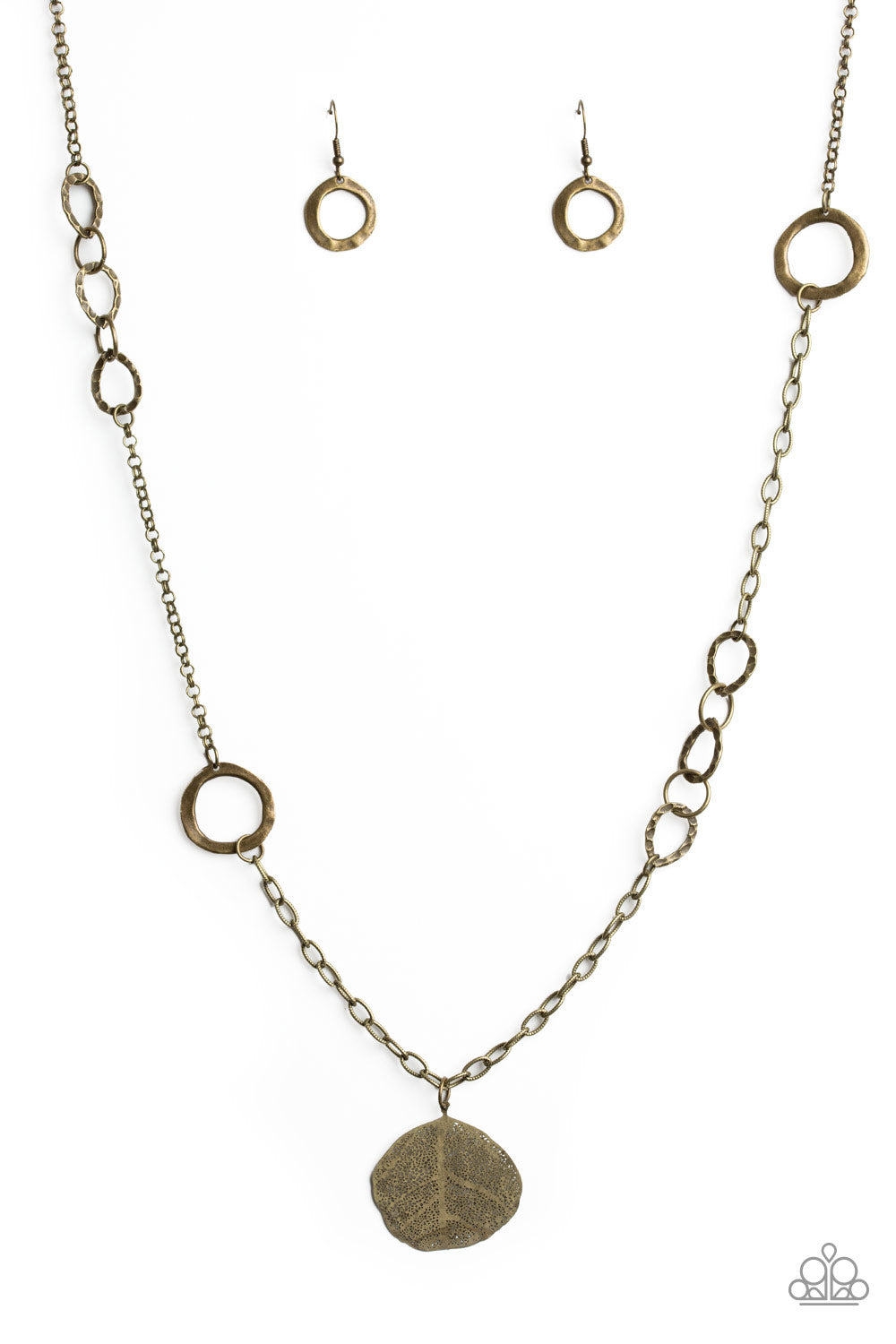 A collection of brass rings and asymmetrical hoops give way to a lifelike brass leaf pendant for a seasonal flair. Features an adjustable clasp closure.