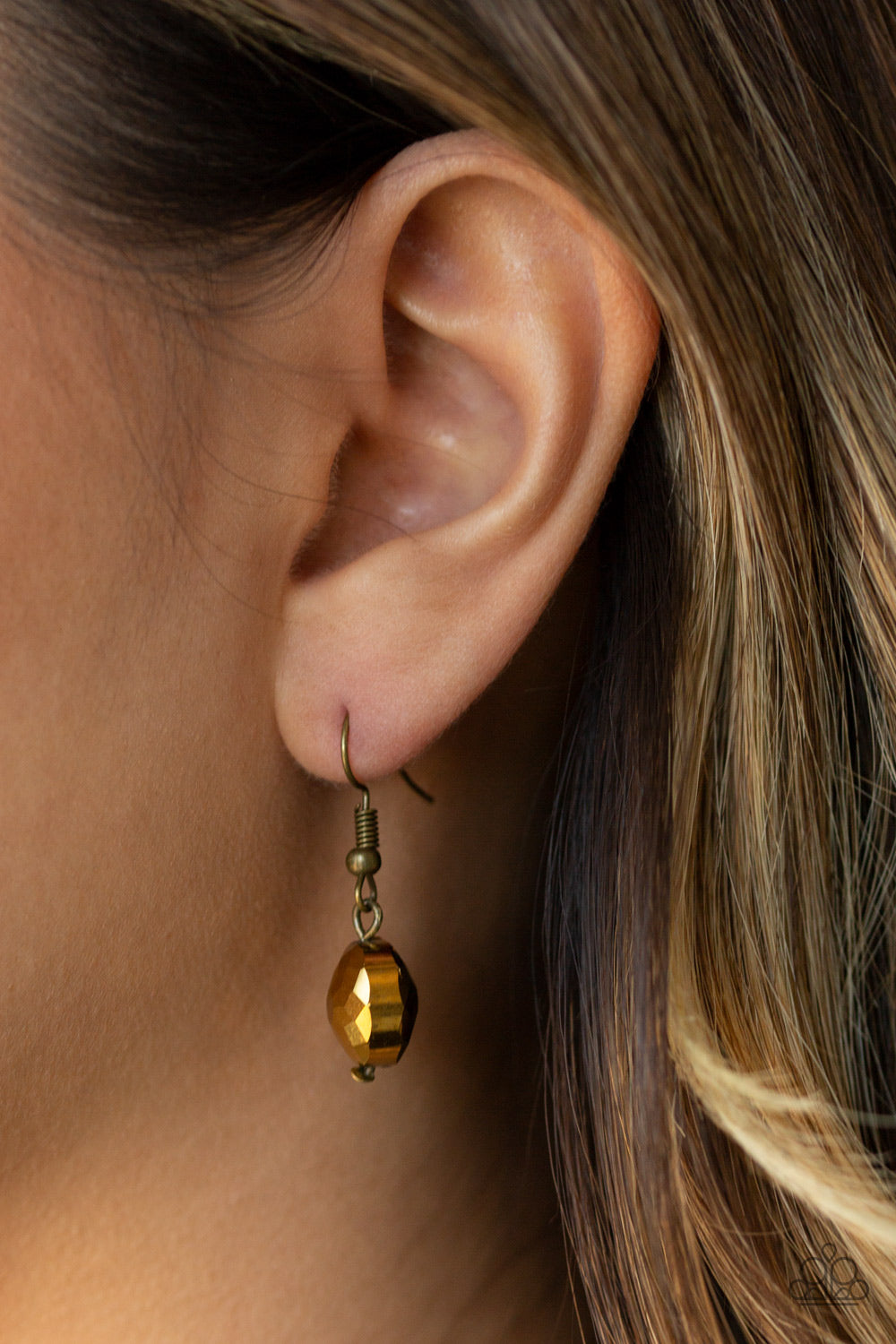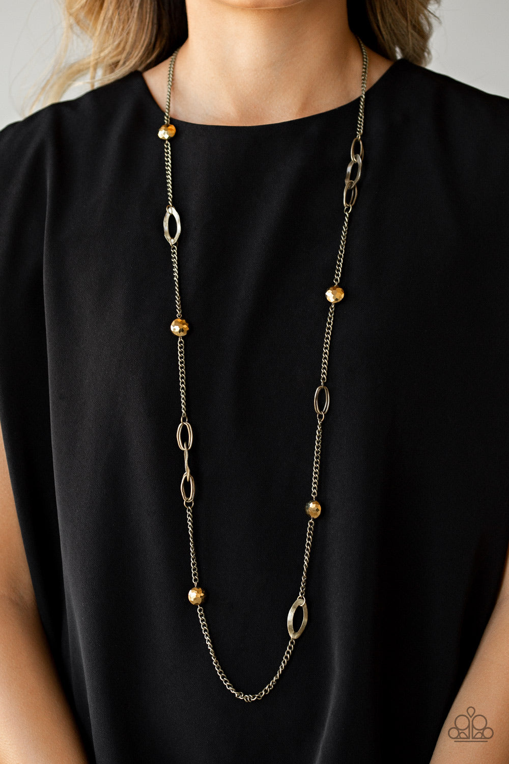 A collection of aurum rhinestone gems and abstract brass rings trickle along a classic brass chain across the chest for a refined flair. Features an adjustable clasp closure.