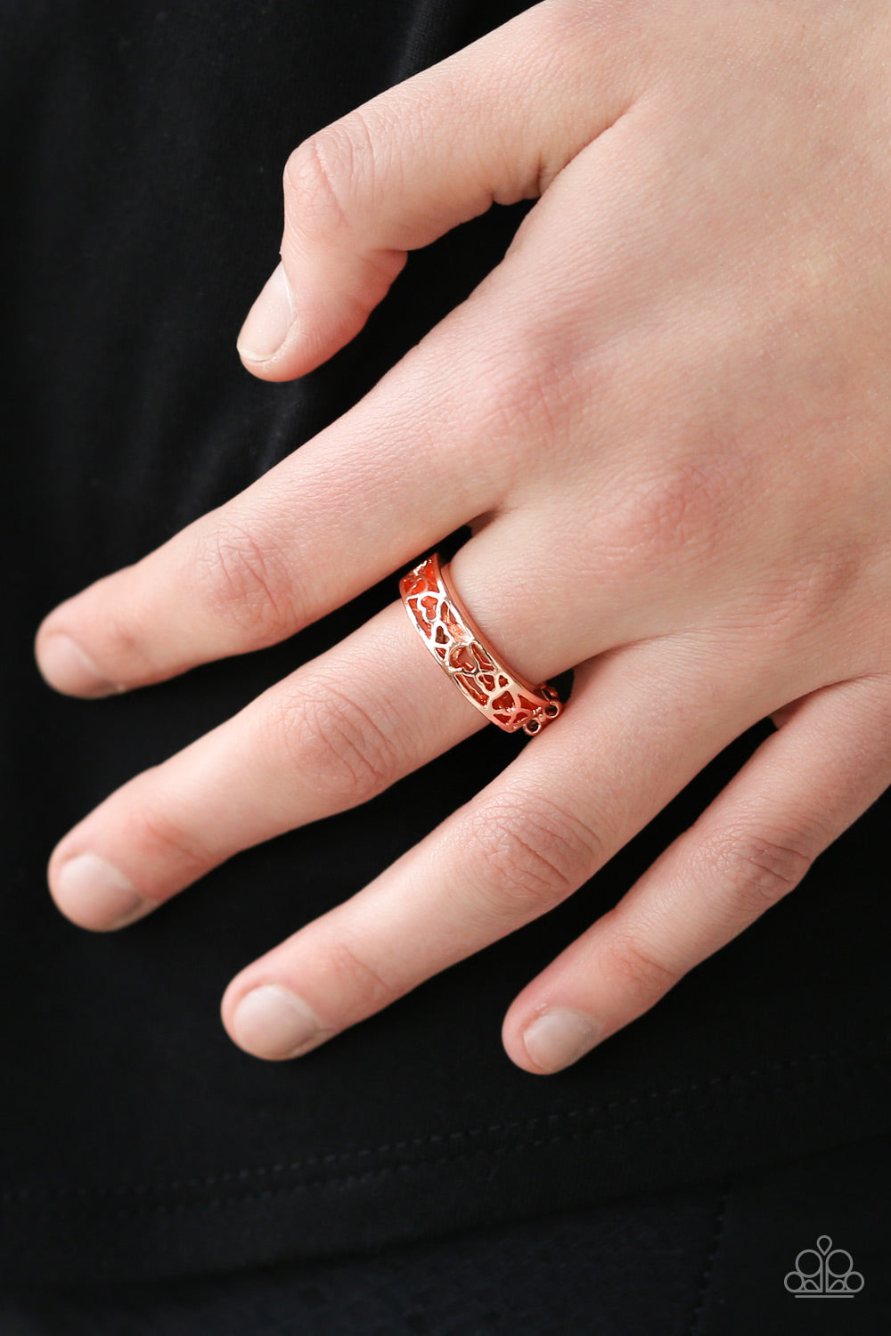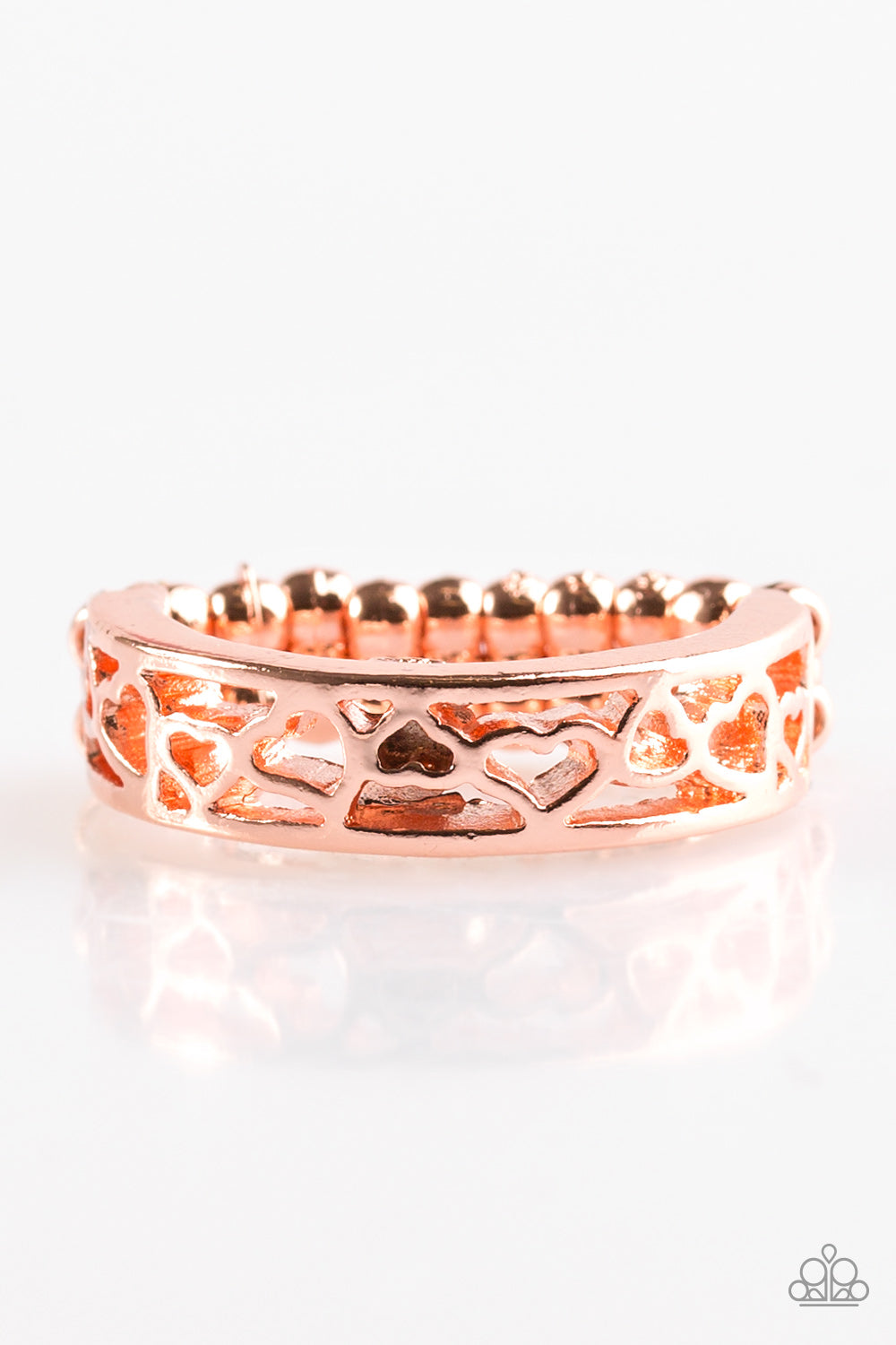 Dainty shiny copper heart silhouettes connect down the center of a shiny copper band, creating an airy frame. Features a dainty stretchy band for a flexible fit.