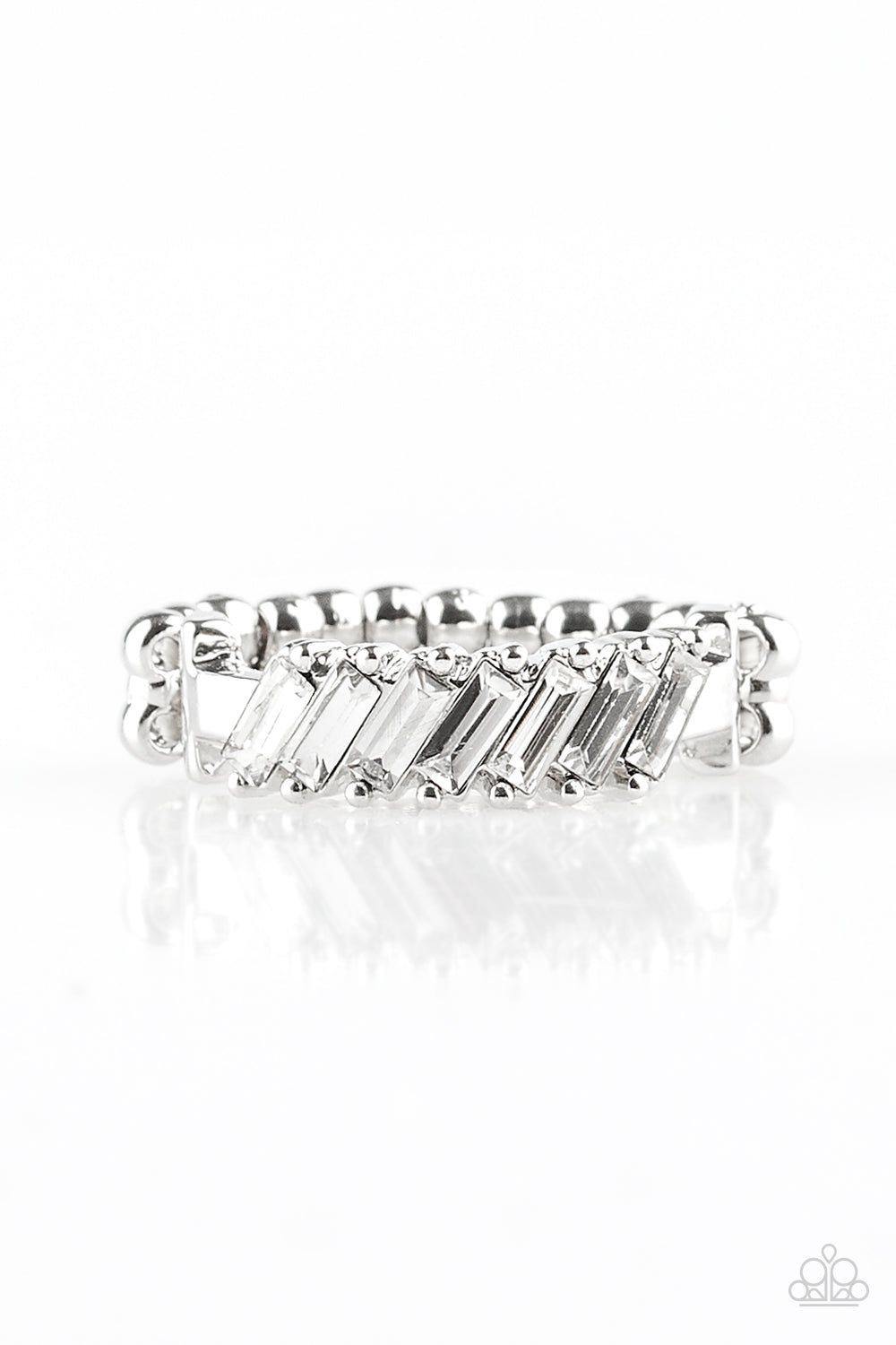 Featuring regal emerald-style cuts, dainty white rhinestones slant across the finger, coalescing into a glamourous band. Features a dainty stretchy band for a flexible fit.