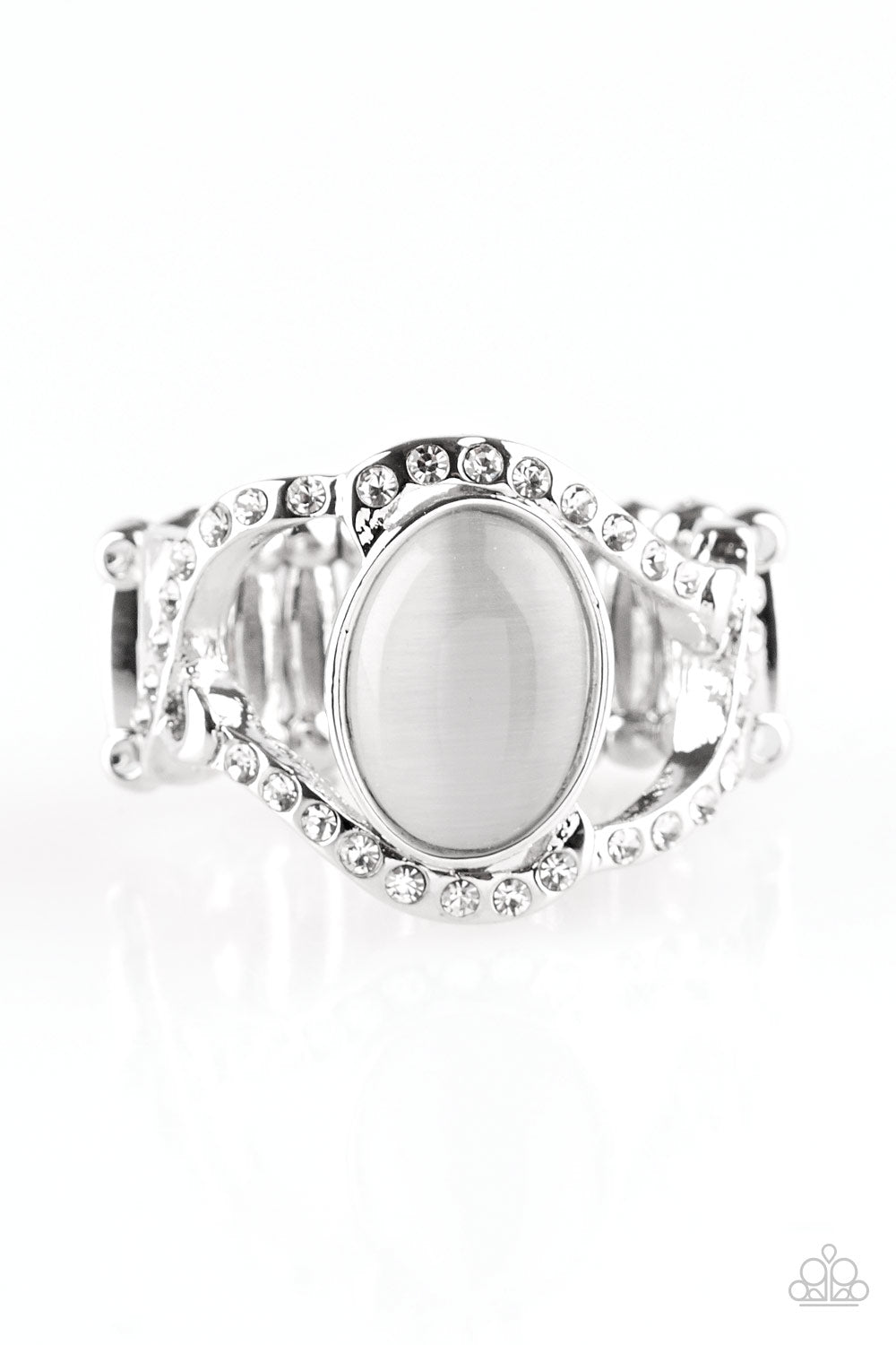 Encrusted in glassy white rhinestones, shimmery silver bars swoop around a glowing white moonstone centerpiece for a whimsical look. Features a stretchy band for a flexible fit.