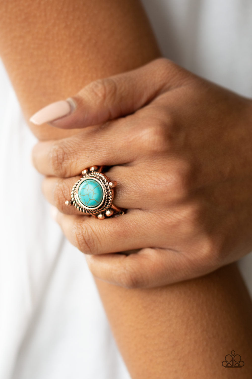 A refreshing turquoise stone is pressed into the center of a copper frame radiating with studded and twisted rope-like textures for an artisan inspired look. Features a stretchy band for a flexible fit.