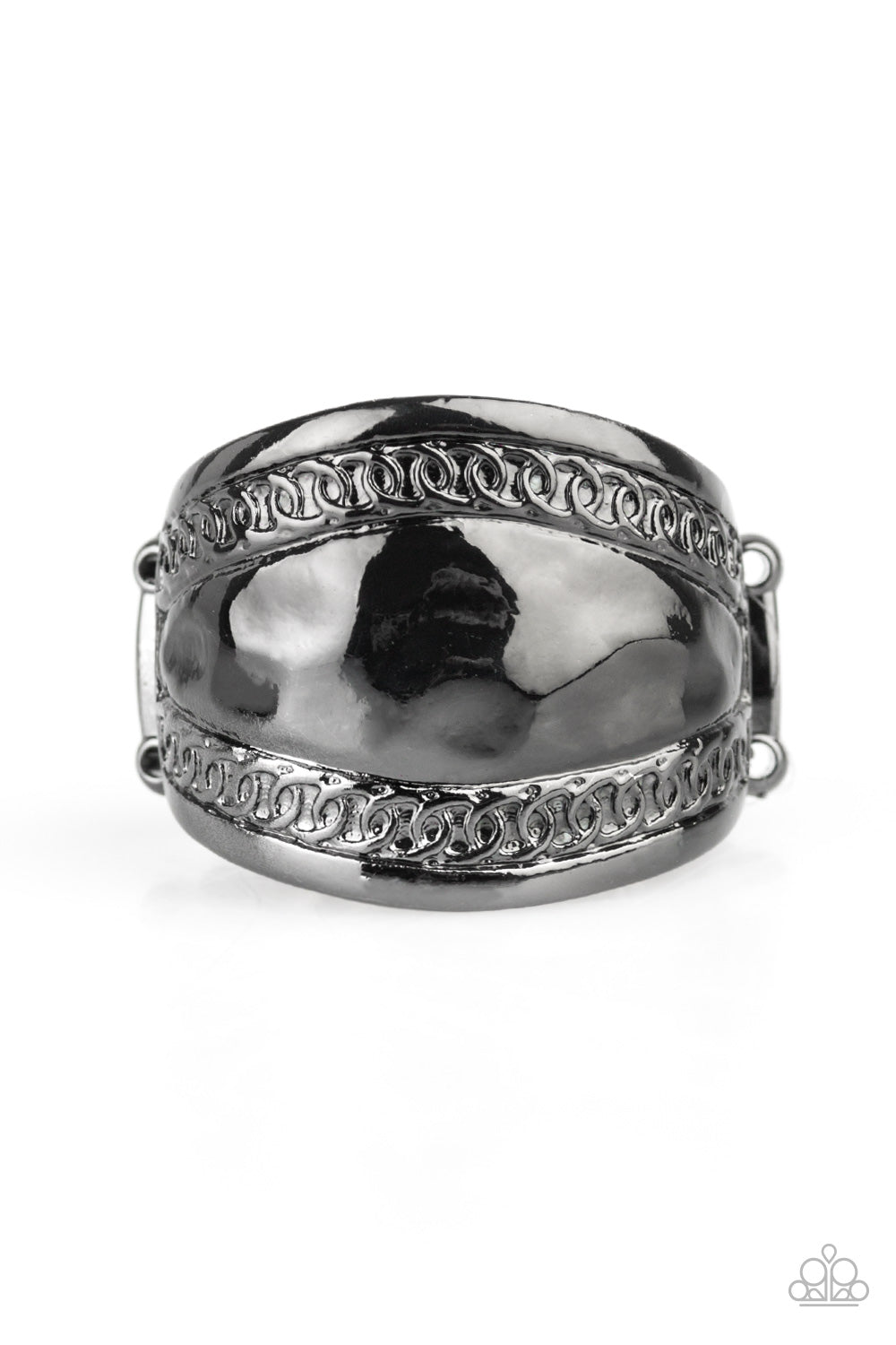 Ribbons of circular texture are embossed along the borders of a hammered gunmetal band for an edgy look. Features a stretchy band for a flexible fit.