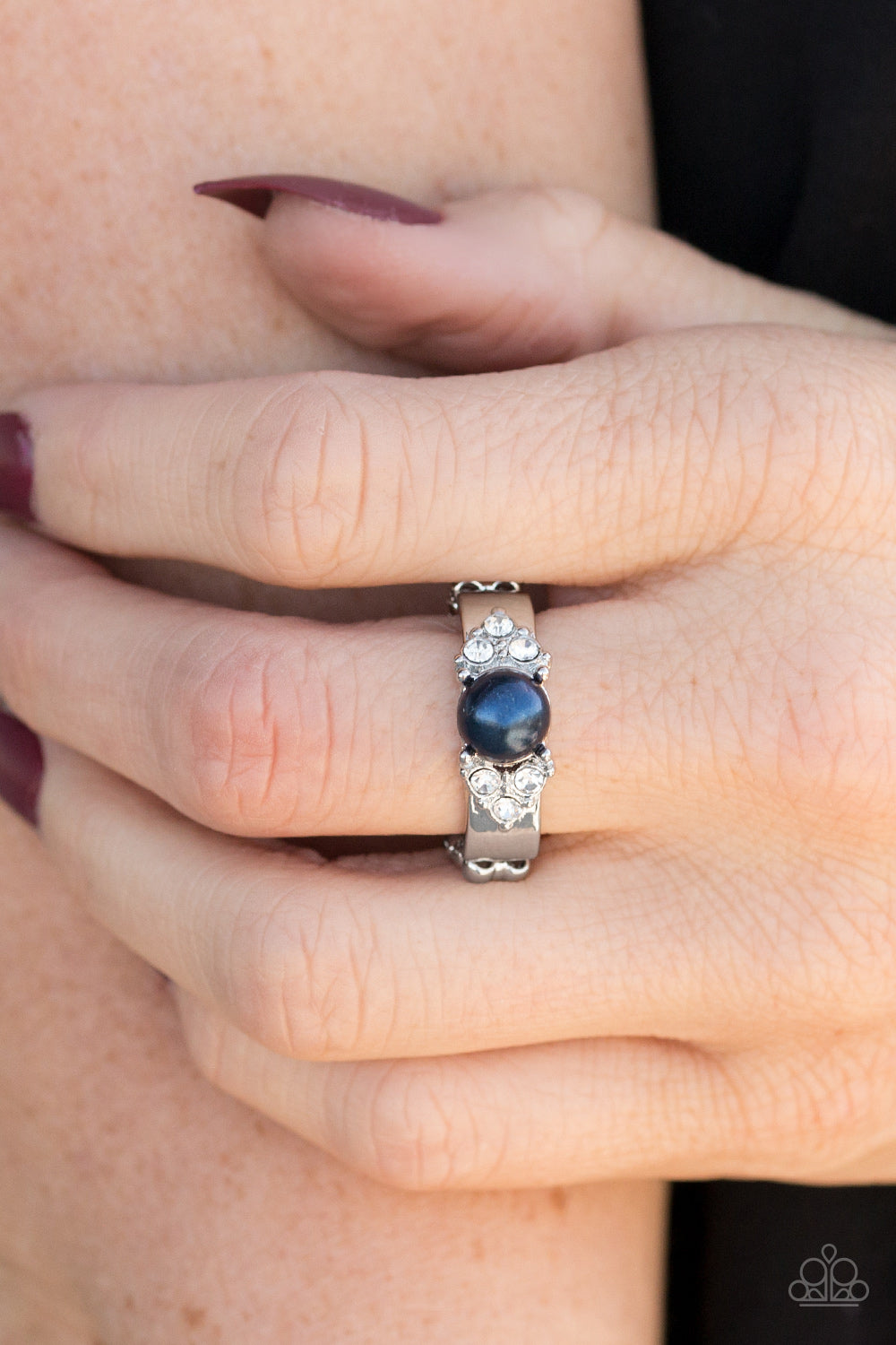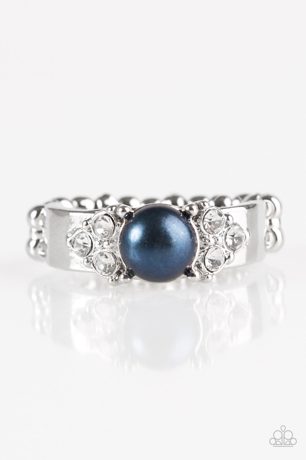 A classic blue pearl is pressed into the center of a glistening silver band radiating with glittery white rhinestones for a timeless look. Features a dainty stretchy band for a flexible fit.