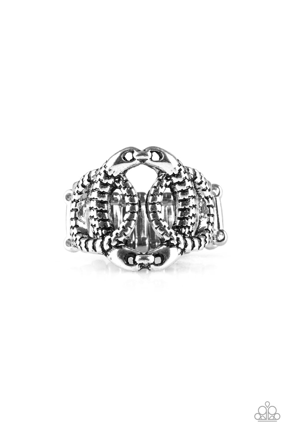 Etched in edgy asymmetrical textures, three glistening silver rings link across the finger, creating a bold industrial centerpiece. Features a stretchy band for a flexible fit.