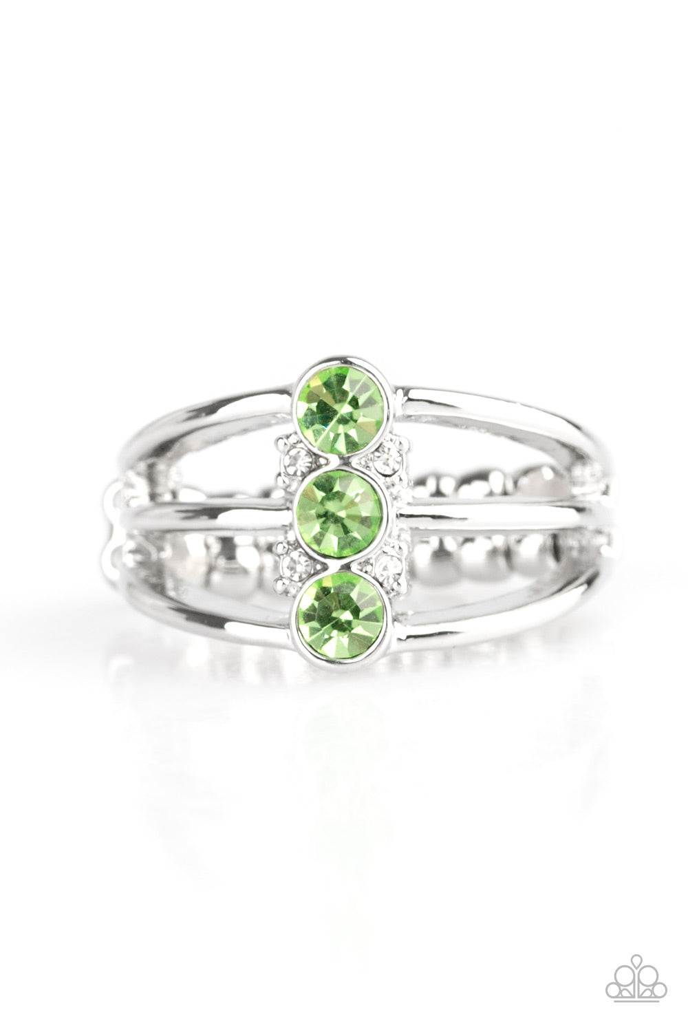 Glistening silver bands arc across the finger, coalescing into an airy frame. Infused with dainty white rhinestones, three green rhinestones are encrusted down the center of the bands for a refined finish. Features a dainty stretchy band for a flexible fit.