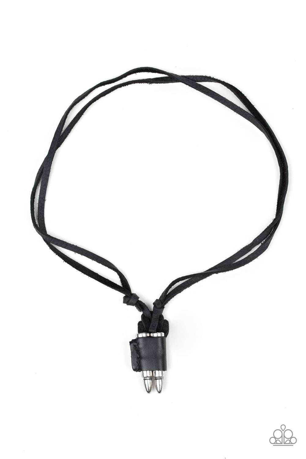 A piece of black leather wraps around a pair of silver bullets, creating an edgy urban pendant at the bottom of knotted strands of black suede. Features an adjustable sliding knot closure.