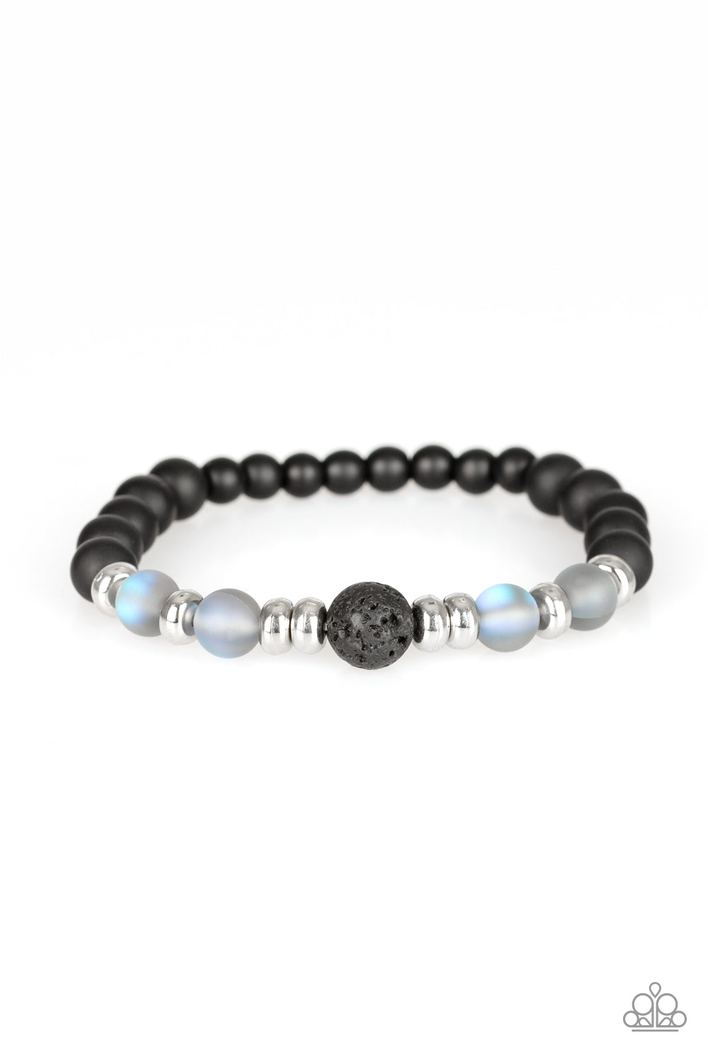 Infused with dainty silver beads, a collection of black stone beads, black lava rock beads, and glassy iridescent beads are threaded along a stretchy band around the wrist for a seasonal flair.