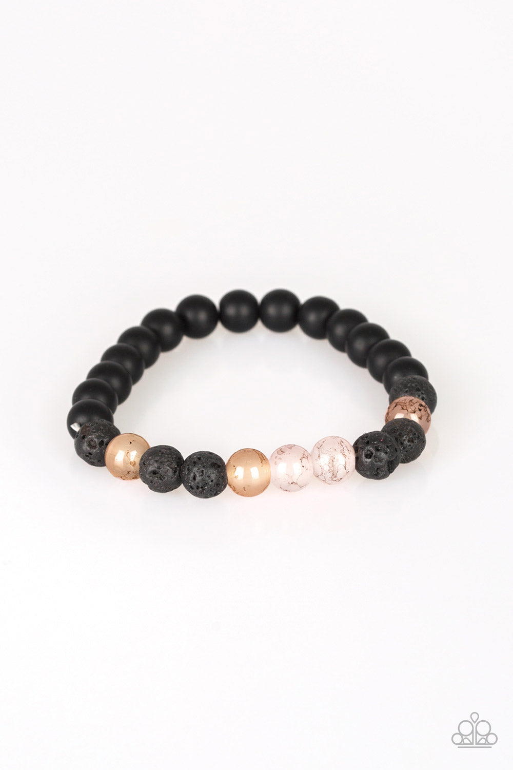 A collection of cloudy stone beads, polished black stone beads, and earthy black lava rock are threaded along a stretchy band for a seasonal look.