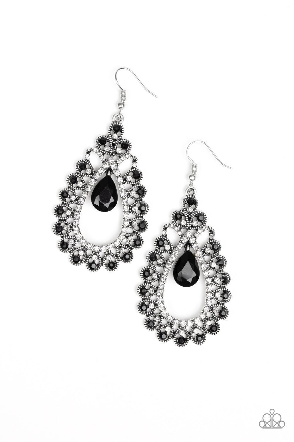 A black teardrop gem swings from the top of a frilly silver frame radiating with glassy white and glittery black rhinestone encrusted petals for a regal look. Earring attaches to a standard fishhook fitting.