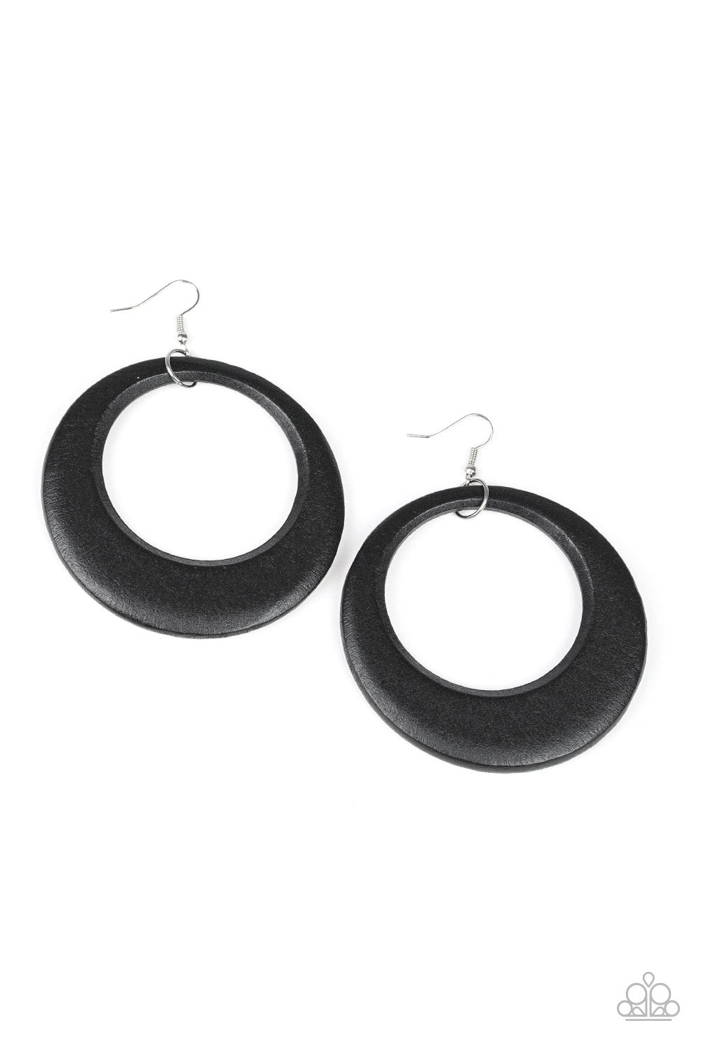 Brushed in a shiny black finish, an airy wooden frame swings from the ear in a seasonal fashion. Earring attaches to a standard fishhook fitting.
